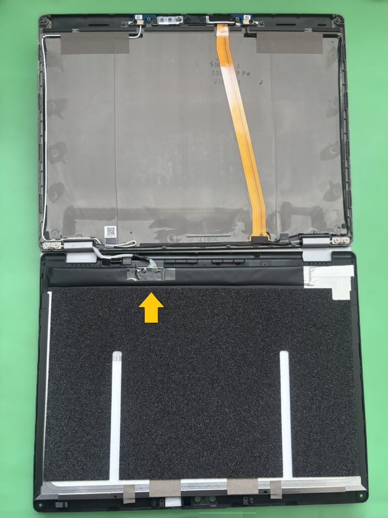 液晶は本体と1ヶ所のコネクタでつながっているので、これも外します。コネクターはロック機構付きなので、無理に引っ張らないで。