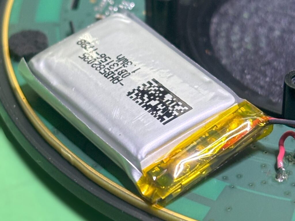Amazon でほぼ同サイズ・同電圧の 3.7V / 300mA のリチウムイオン電池を発見したので、そのまま交換。純正より容量は少し小さいけど、実用上は問題なし。