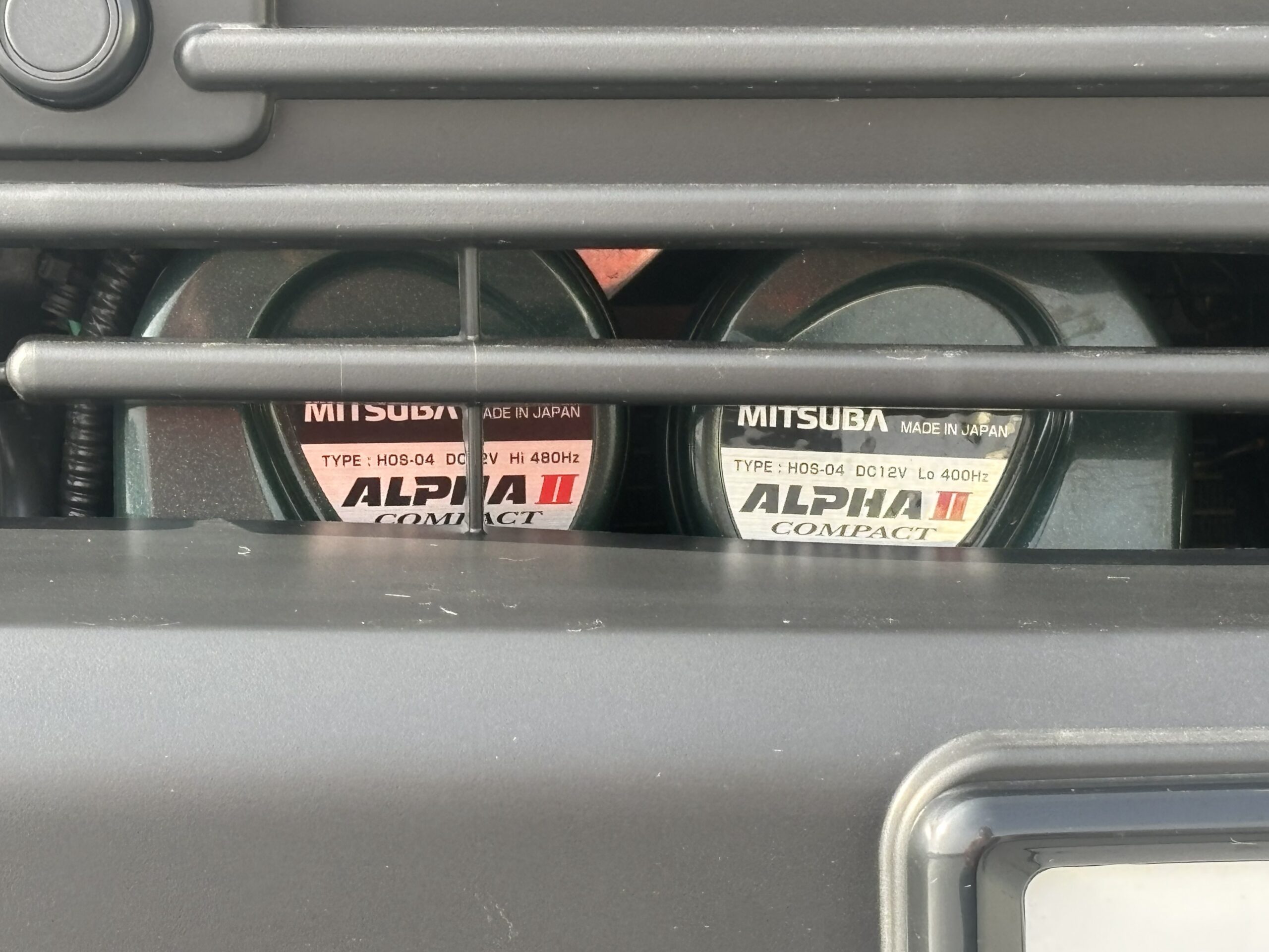 そこで選んだのがミツバサンコーワの 【Alpha II Compact】。本体が薄めで取り付けしやすいし、400Hz+480Hzの和音で鳴ってくれるので、トヨタの上位車種並みの音質が期待できるのが決め手でした。保安基準対応品というのもポイント高し。