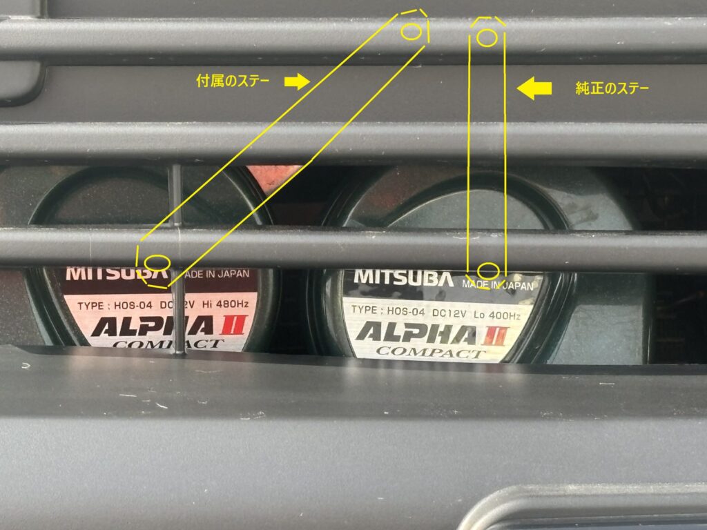 そこで付属ステーを使って、純正ホーンの左側に2個並べて設置することにしました。丁度純正のステーの隣にネジ穴があるので共締めです。