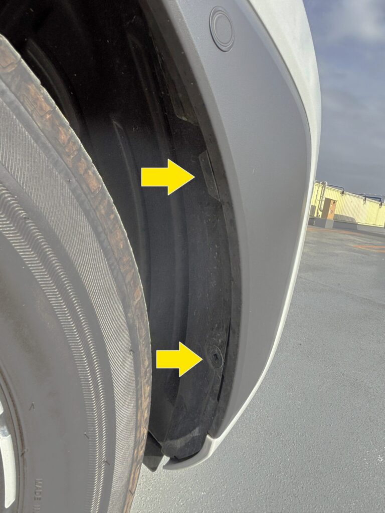 - タイヤハウス内のピン1本+パチン止め(奥に押すと外れすい)を左右とも外す