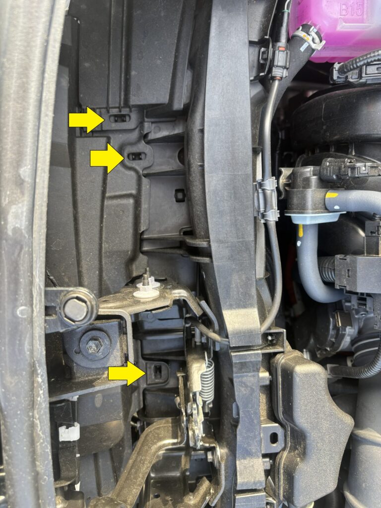 そこでラジエター上部のカバーを外します。これは上から細い工具でつまむとロックが外れるタイプで、全部で7ヶ所ほど。
