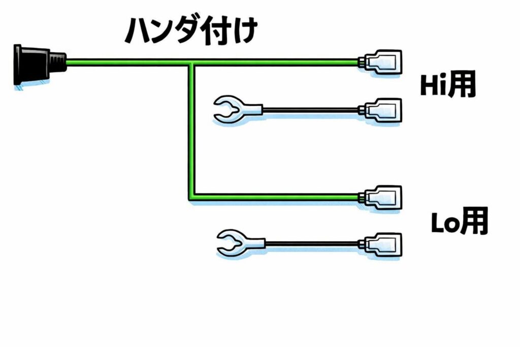 そこでミツバ製の 変換・分岐用配線 をAmazonで調達。純正コネクタにそのまま挿せるので、電気的な作業がめちゃくちゃ楽になります。
