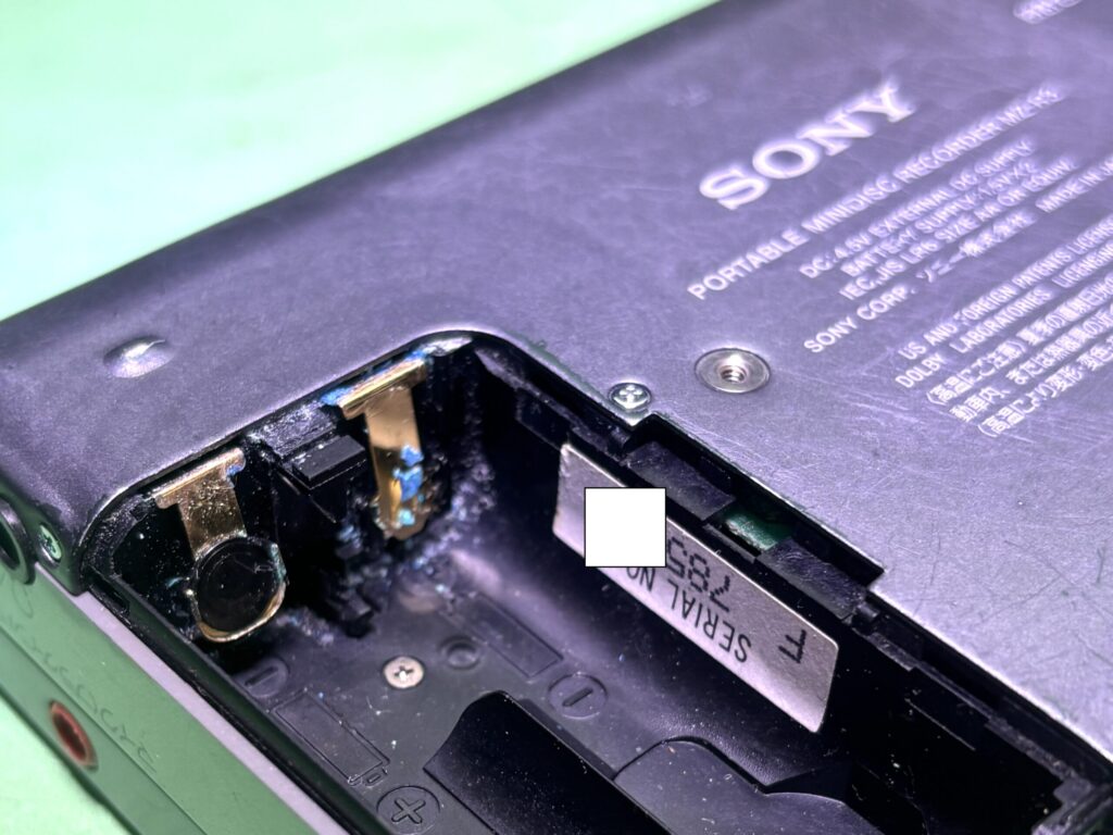 電池ボックスのフタを開けると、電極に緑色の錆がしっかり発生。