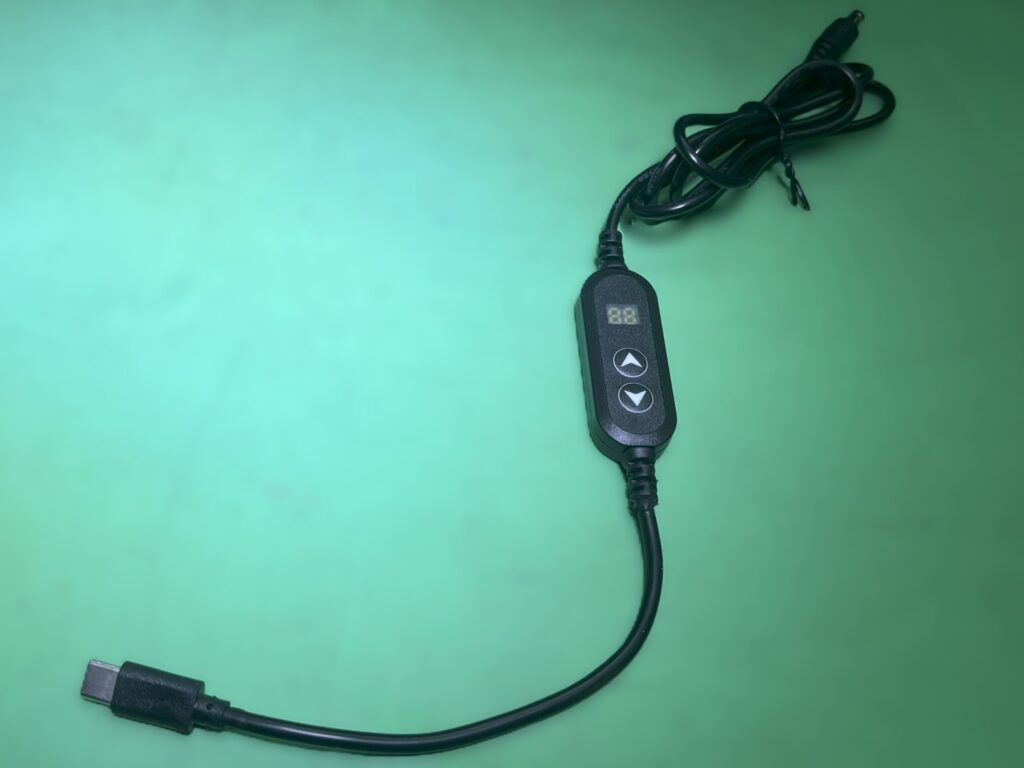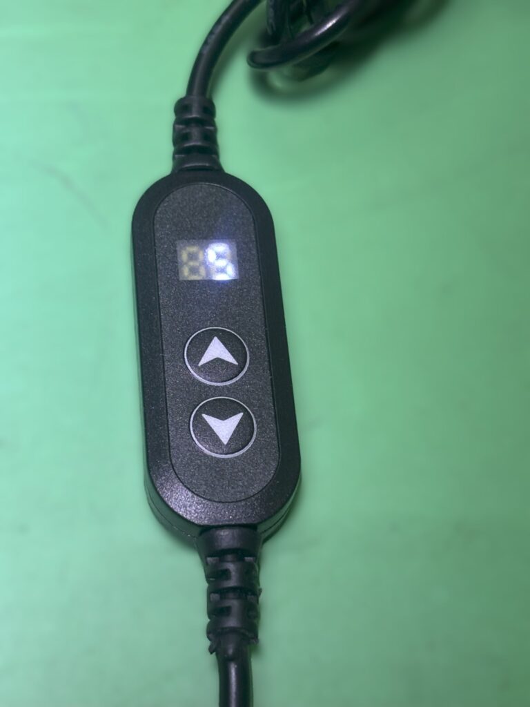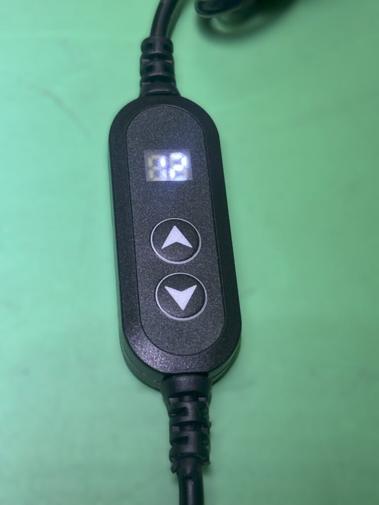 ケーブルの途中に Up/Downスイッチ が付いていて、押すだけで電圧を変更できます。