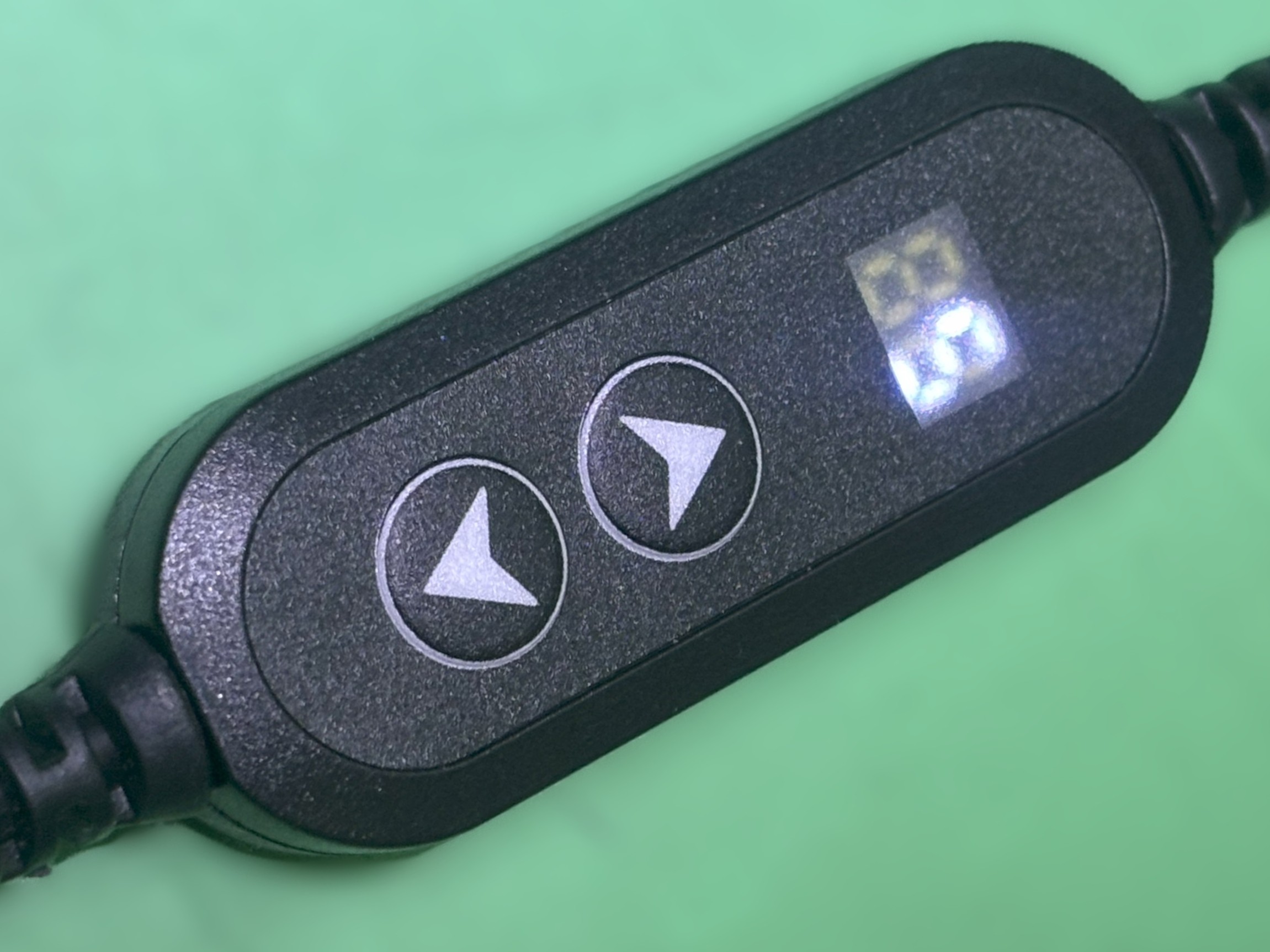 ケーブルの途中に Up/Downスイッチ が付いていて、押すだけで電圧を変更できます。